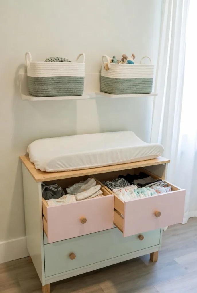 Wall shelves or baskets above the changing area add extra storage without taking up floor space. This approach keeps everything within arm’s reach while saving room.