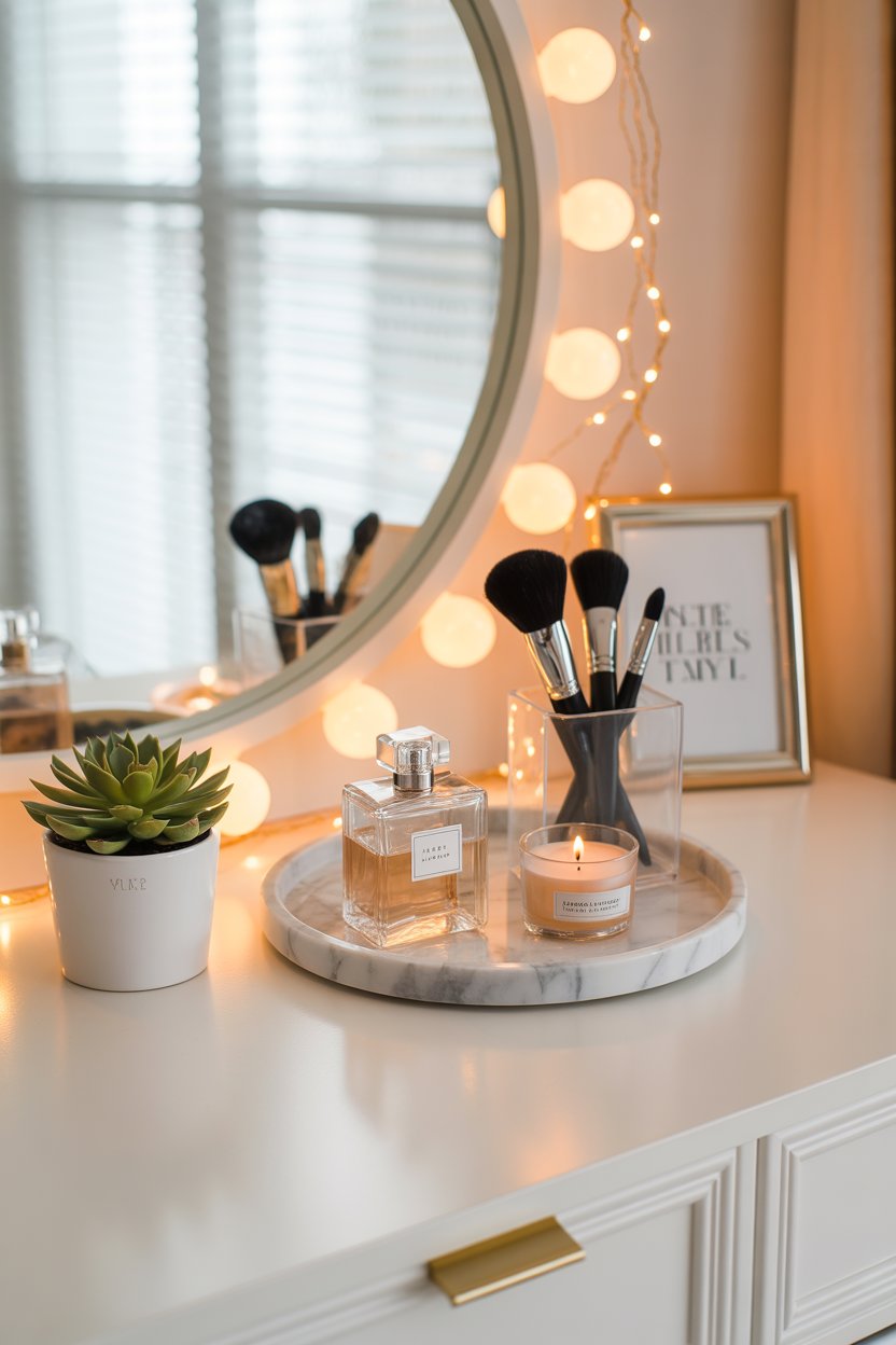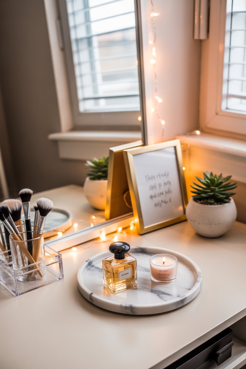 Use decorative perfume trays. A mirrored or marble-look tray holding your perfume bottles, a small candle, and your daily moisturizer creates a luxury lifestyle aesthetic that looks effortlessly curated.