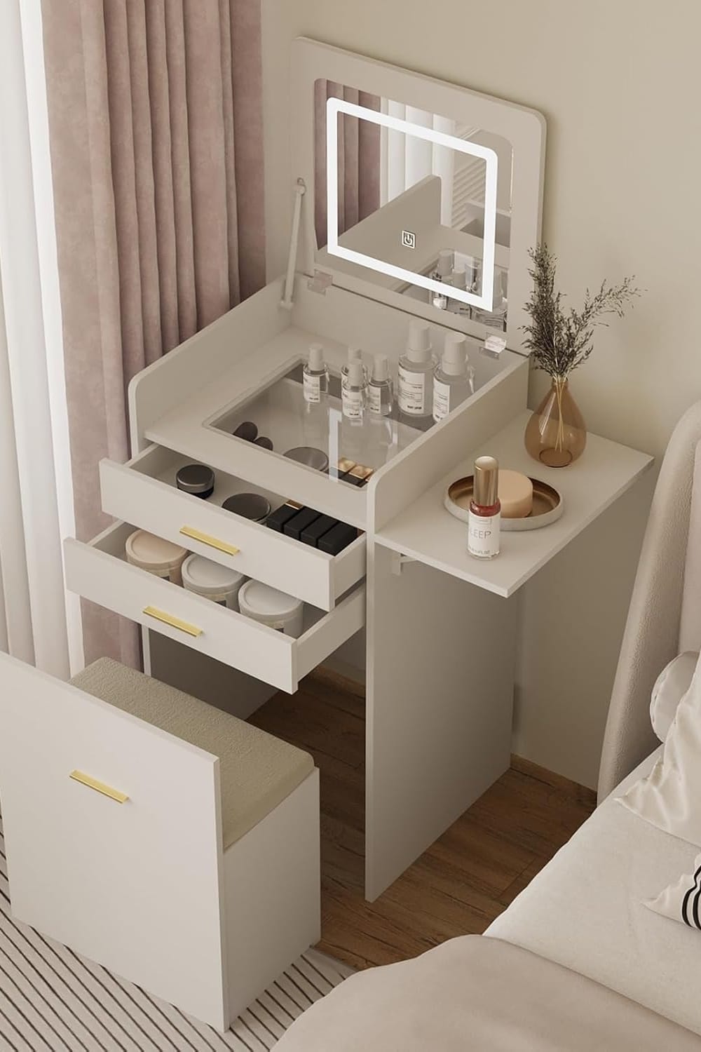 Storage Options: The best budget vanity tables offer smart storage without adding bulk. Look for drawers, side shelves, built-in compartments, or mirror storage pockets. A vanity table with zero storage forces you to buy separate organizers — which adds to your total cost.
