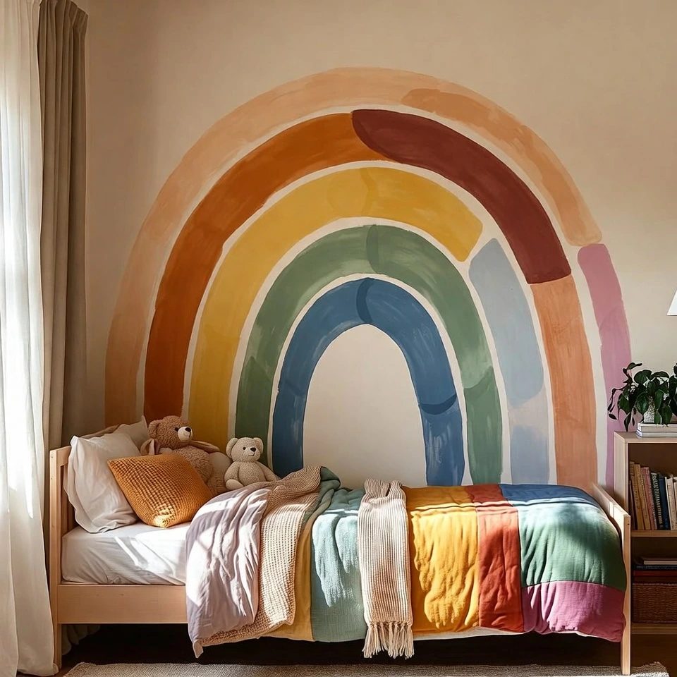 Paint a rainbow mural above the bed using soft warm shades.