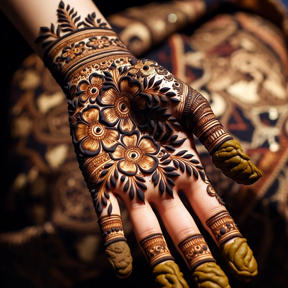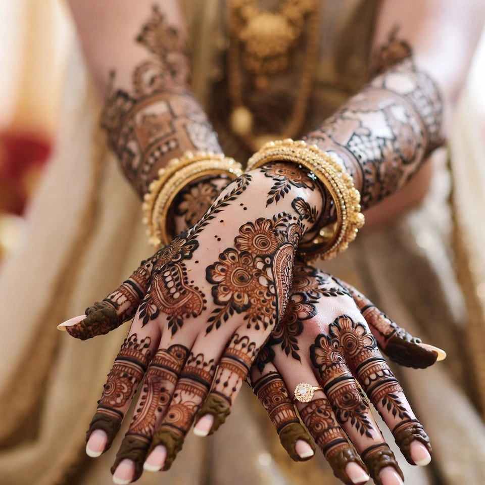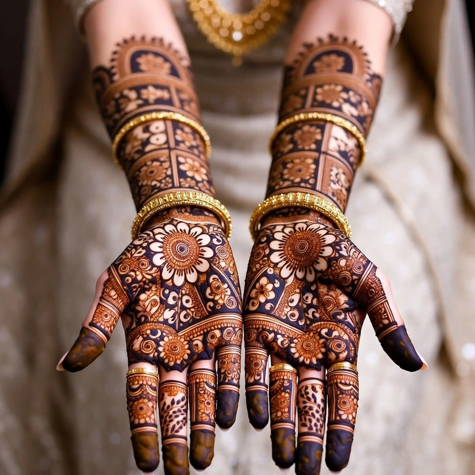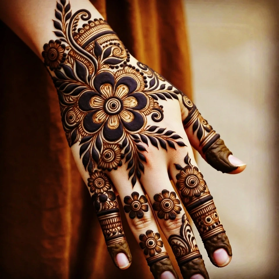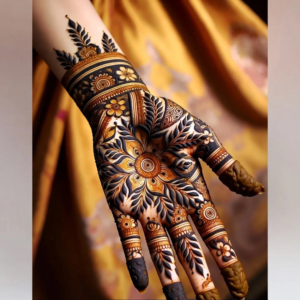 Full hand mehndi designs cover the entire palm and extend to the wrist or arm. These designs often include layers of detailed patterns that create a luxurious and dramatic look.