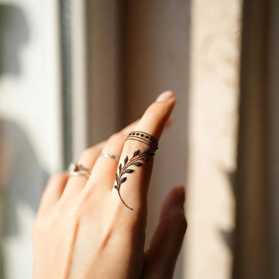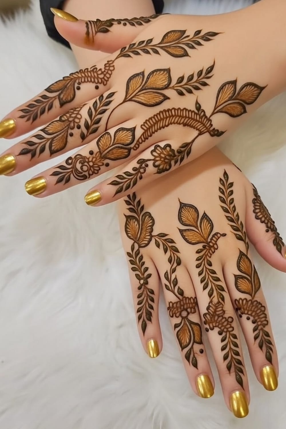 Modern minimal mehndi designs focus on clean lines and simple patterns. These designs may include tiny leaves, rings, or dotted trails across the hand.