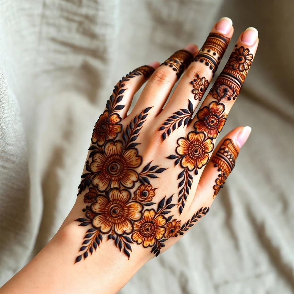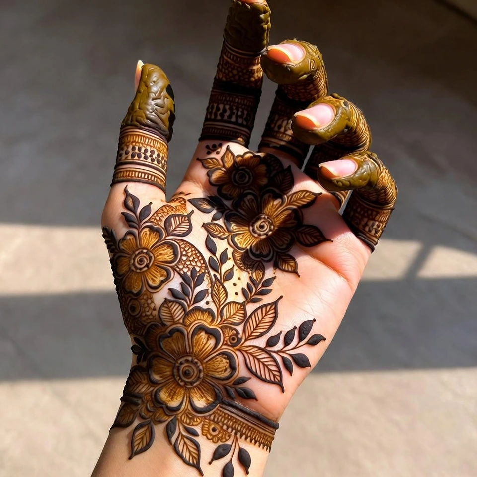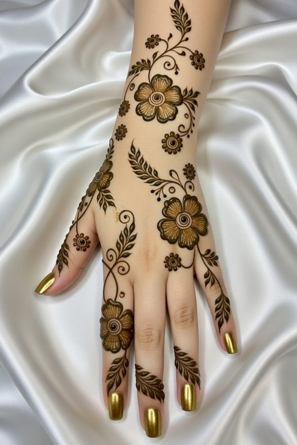 Floral mehndi designs are among the most popular and beginner-friendly patterns. These designs usually feature flowers, leaves, and small vines that create a delicate and feminine look.