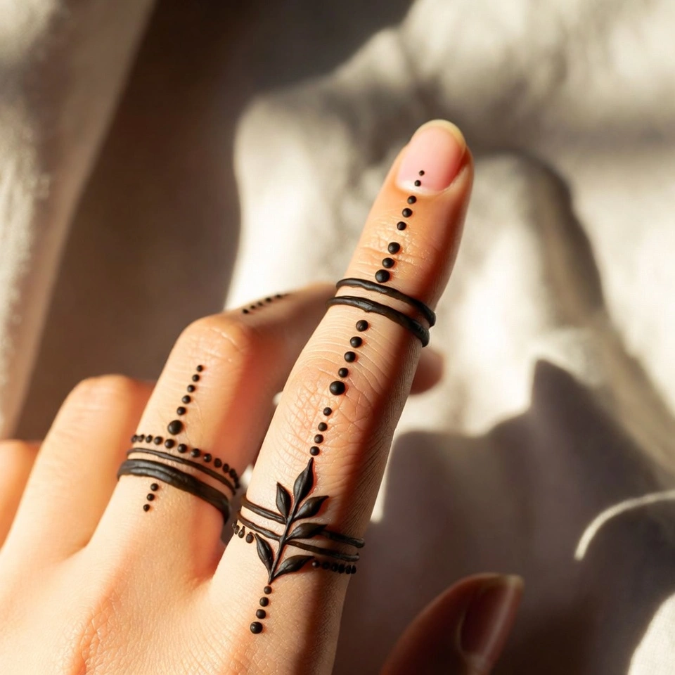 Tiny dots, rings, and small leaf patterns make this design perfect for people who prefer a subtle and modern style. Minimal finger mehndi is also ideal if you want something quick and easy.