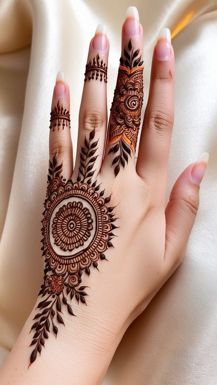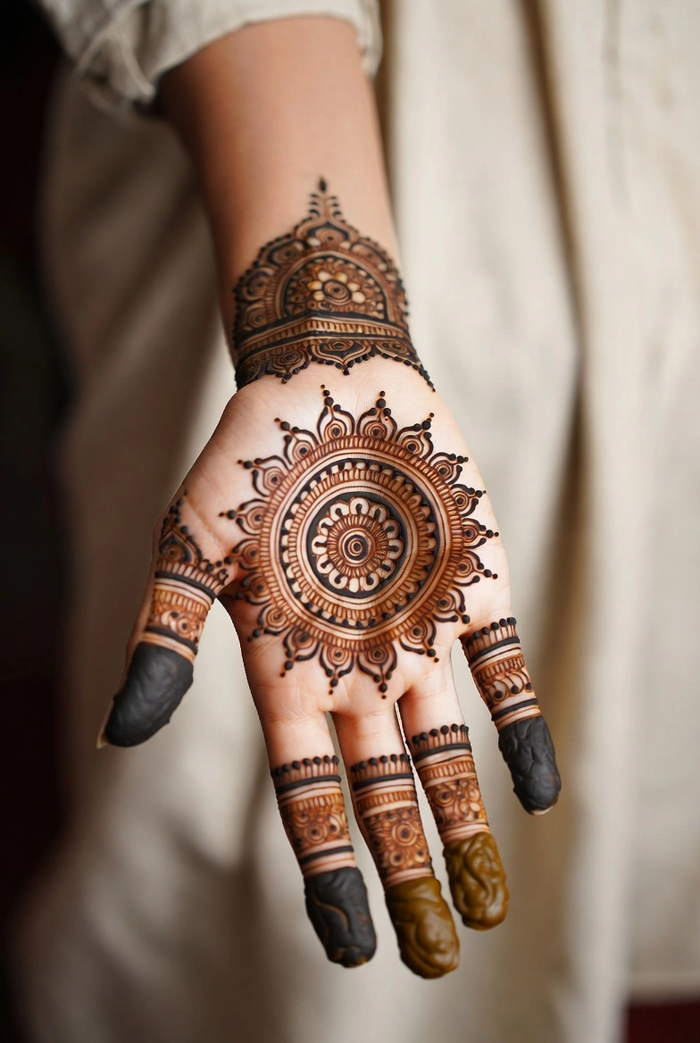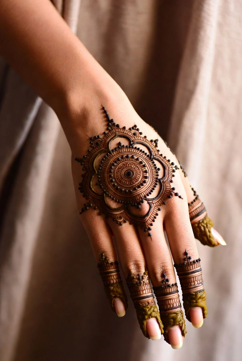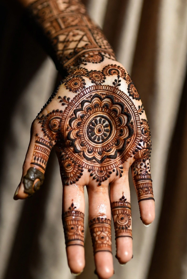 Mandala mehndi designs feature a circular pattern placed in the center of the palm. This design represents harmony and balance and is widely used in traditional henna art.