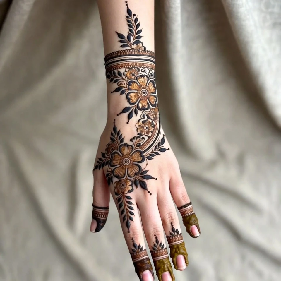 Back hand mehndi designs are extremely popular because they look beautiful in photos. These designs usually feature floral chains or bracelet-style patterns that decorate the back of the hand.