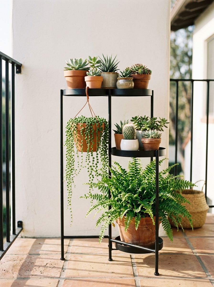 When floor space is the limiting factor, a tiered plant stand is the most space-efficient solution available. A three or four-tier stand holds eight to twelve plants in the footprint of a single large pot.