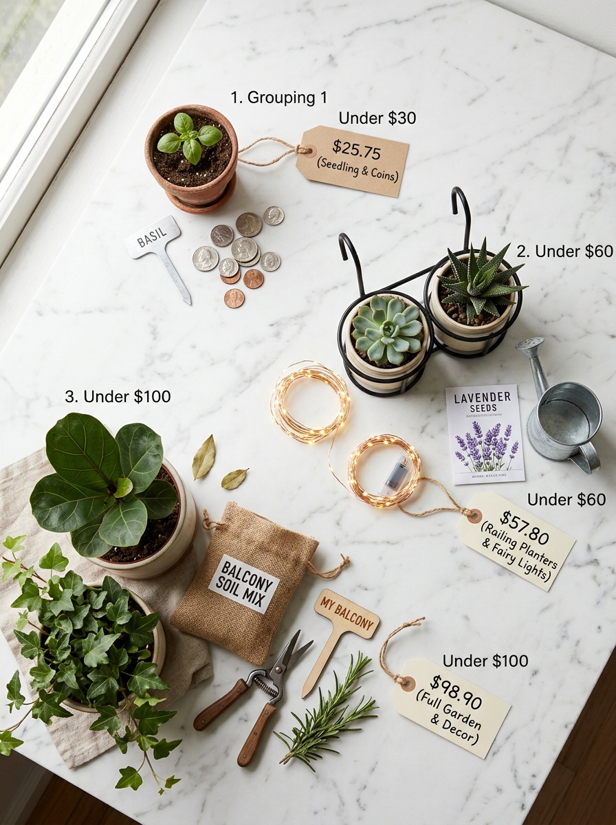 Under $60: Railing planters, a tiered plant stand, fairy lights, and a DIY herb corner. A genuinely complete balcony garden.